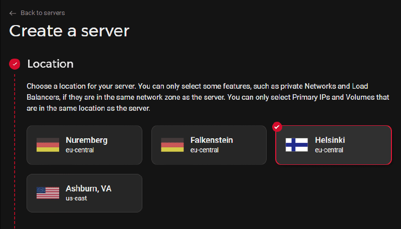 The first selection is the Datacenter Location. Today Hetzner can offer four locations, two in Germany (Nuremberg and Falkenstein), one Datacenter in Helsinki, and another one in Ashburn