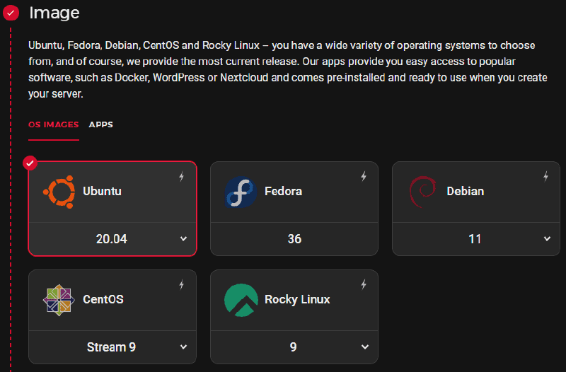 You have a wide variety of operating systems to choose from. If you know what you need – just pick one. If you do not – I suggest you pick the one that is under the “Requirements list” for your service.