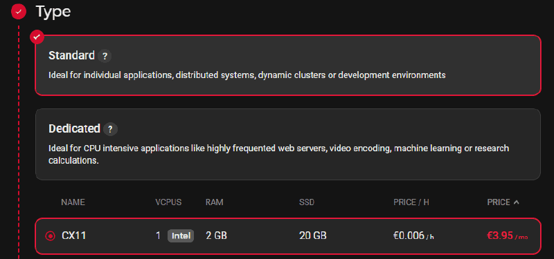 For my Monitoring Project, the smallest options will work fine. So I pick CX11
