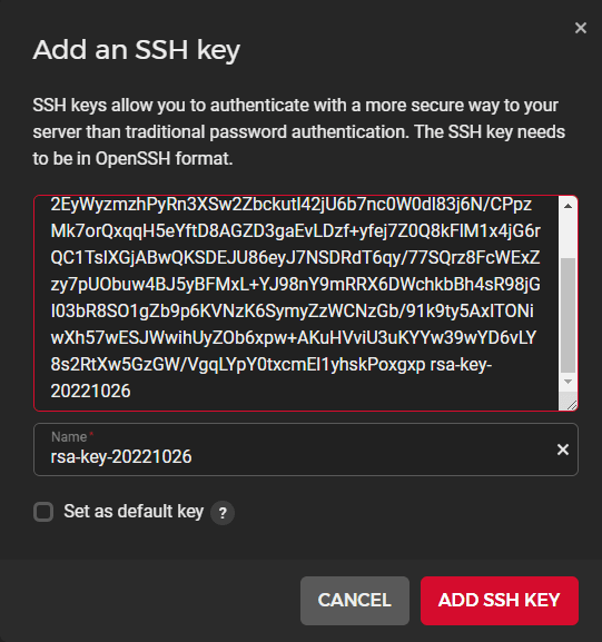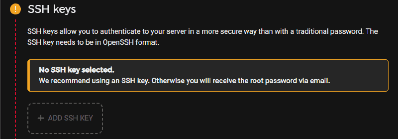 I strongly recommend you add your own SSH Keys to the server. Click on + ADD SSH KEY
